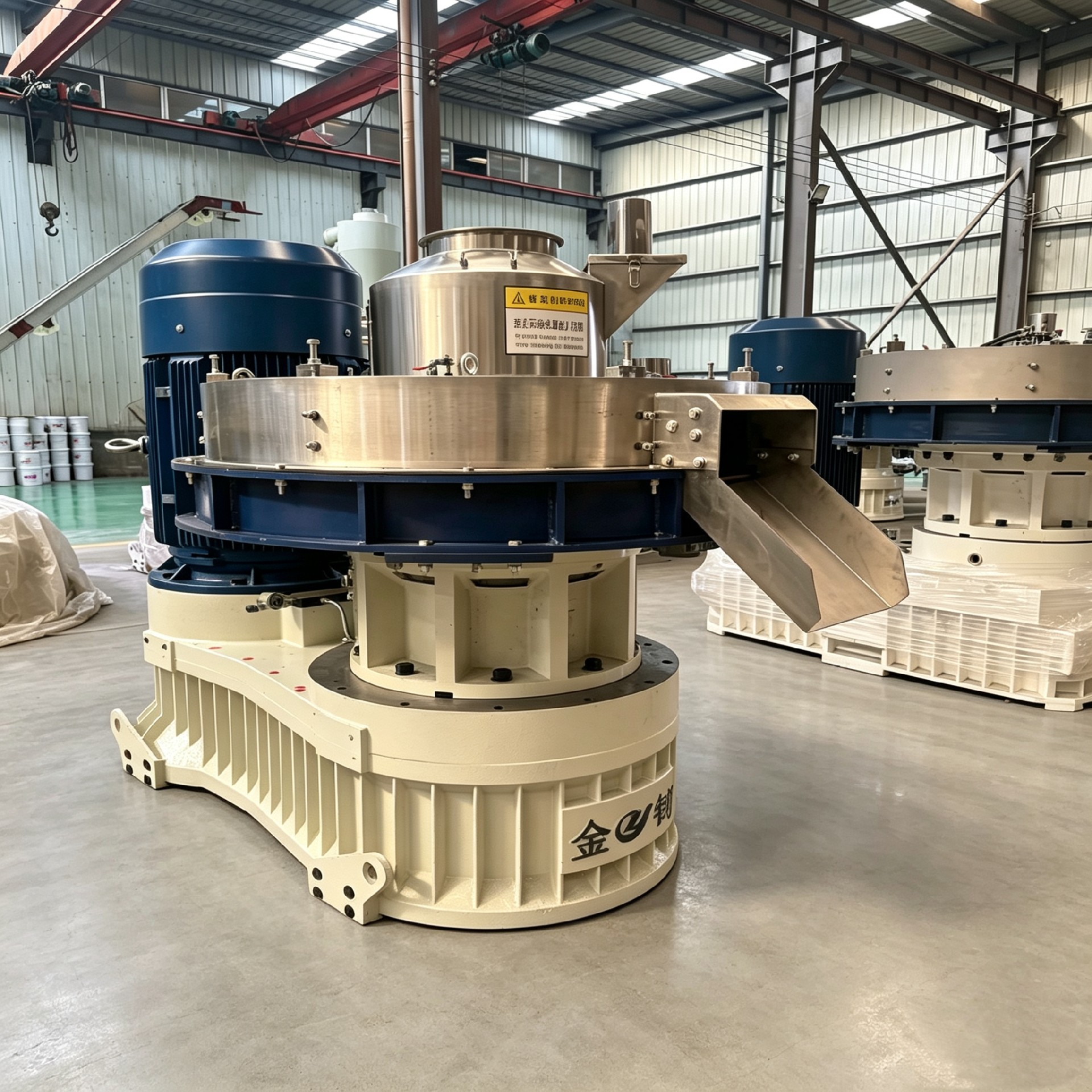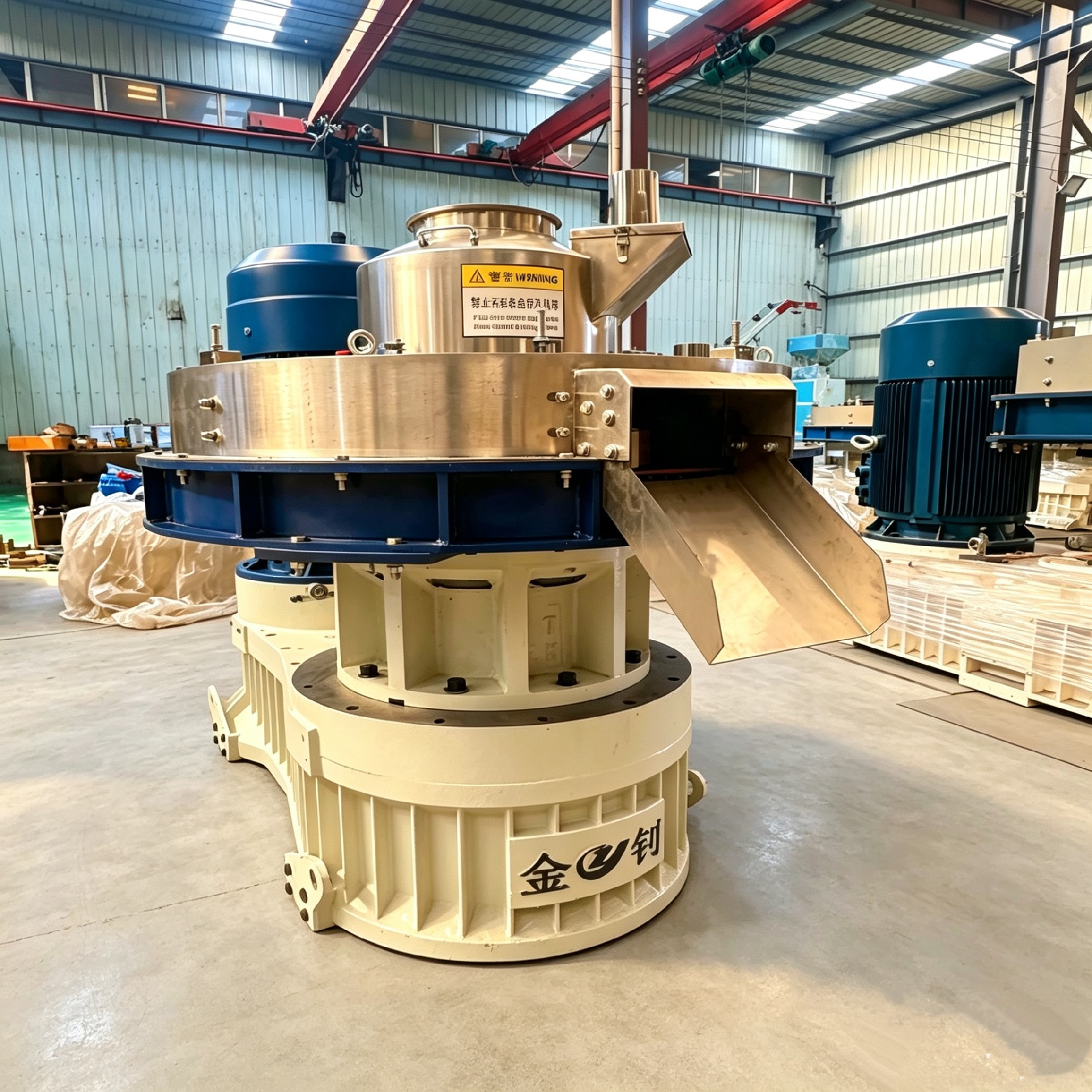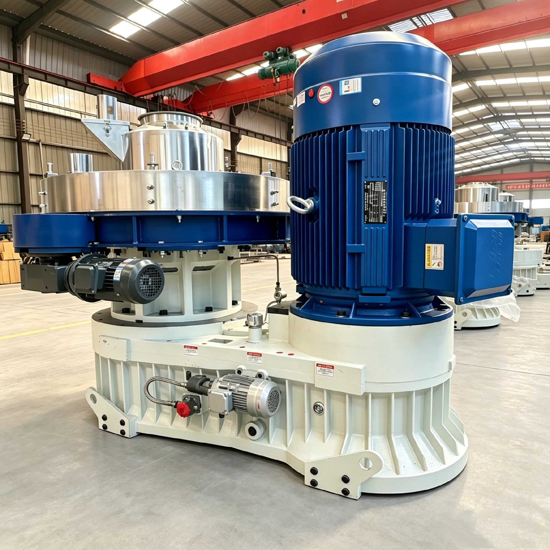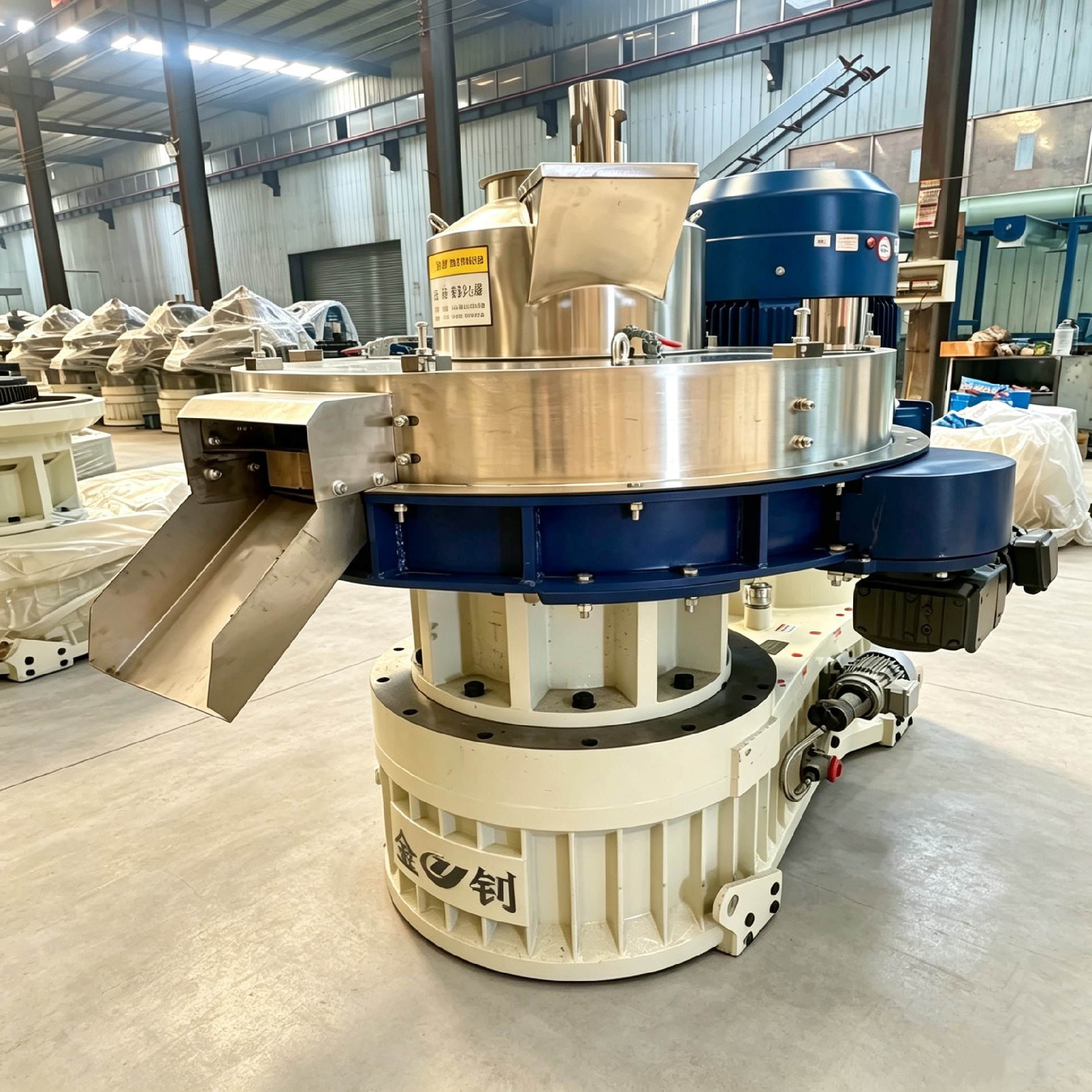 生物质颗粒机的工作原理属于“模辊挤压式”成型。粉碎后的生物质原料(含水率一般控制在10%-20%)从进料口进入压制室,在压辊与模具之间的强力挤压作用下,物料被压入模具孔内,在孔内经过挤压固化后,从模具另一侧挤出成圆柱状颗粒,再由切刀按设定长度切断。整个过程是在常温条件下进行的“冷态致密成型加工”。